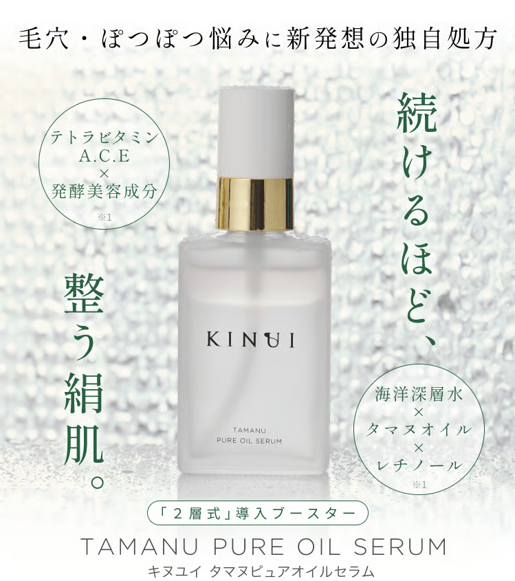 KINUI タマヌピュアオイルセラムは、日本古来の美容知と現代の肌研究に着想を得て開発されたオイル美容液。シンプルでありながら、毎日のケアに取り入れやすい設計が特徴です。